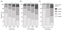 Figures 1a-c show proportions of patients with each oral function score by age group, CDAI category, and frailty status, respectively. The proportion of patients with oral function decline (oral function score ≥2 points) was significantly lower in patients aged <60 years compared to those aged ≥80 years (13.9% and 50.3%, respectively; p<0.001), in those in remission compared to those with HDA (20.6% and 46.4%, respectively; p<0.001), and in those who were robust in frailty status compared to those who were frail (1.6% and 54.8%, respectively; p<0.001), as assessed by the Cochran-Armitage trend test.