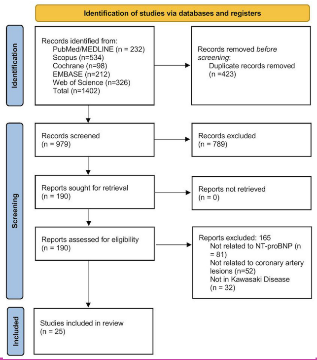 Studies (observational cohort, case-control, and crosssectional) that evaluated NT-proBNP in KD patients were included. Case series, reports, review articles, editorials, and studies on non-humans were excluded.