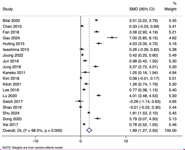 Nineteen studies involving 9017 participants compared the mean and SD of NT-proBNP levels in KD patients with/ without CAL. The pooled SMD was 1.889 (95% CI: 1.274 to 2.504, P < .001), indicating considerably higher NT-proBNP levels in patients with CAL (Figure 2). Substantial heterogeneity was observed (I2 = 98.5%, P < .001), with a tau[2] value of 1.7860. The funnel plot was asymmetrical (Supplementary Figure 1) and significant Egger’s test (P= .002) indicated the possibility of publication bias.