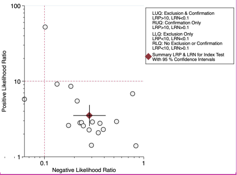 An LR scattergram (Figure 5) demonstrated that the estimates were in the right lower quadrant, indicating that it cannot be used for either confirmation or exclusion. Substantial heterogeneity was observed (I2 = 99%, P < .001), with a minor contribution from the threshold effect (proportion of heterogeneity due to threshold effect = 0.13) (Figure 6). The funnel plot (Supplementary Figure 2) was asymmetrical, and Deek’s test was significant (P= .01).