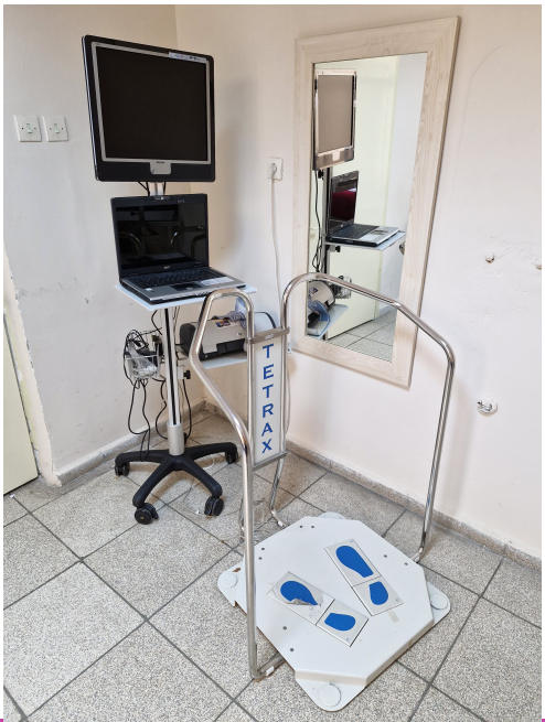 The fall index was calculated using the software program of Tetrax® ; (Sunlight Medical Ltd., Ramat Gan, Israel), a Tetra-ataxiometric posturography system, which is the device used to evaluate static balance. This posturography assesses postural sway by measuring weight shifts on 4 separate force plates under the left and right forefoot and hindfoot. The patients were instructed to stand on the platform without shoes and the test was performed in 8 different positions: eyes open, eyes closed, eyes open on a pillow, eyes closed on a pillow, head turned to the right and left with eyes closed, head flexed 30 degrees backward and 30 degrees forward with eyes closed. The test was measured for 32 seconds for each position. The standard eye-opening position serves as a reference for comparison. The risk of falling increases as the fall index increases[26] (Figure 2).