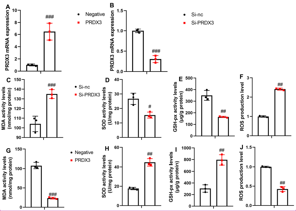 We transfected PRDX3 or si-PRDX3 plasmid to enhance or inhibit PRDX3 mRNA expression in the in vitro model, respectively (Figure 3A and B). Si-PRDX3 increased the MDA activity levels and ROS production levels while decreasing SOD and GSH-PX activity levels in the in vitro model (Figure 3C-F). PRDX3 upregulation reduced MDA activity levels and ROS production levels and increased SOD and GSH-PX activity levels in the in vitro model (Figure 3G-J).