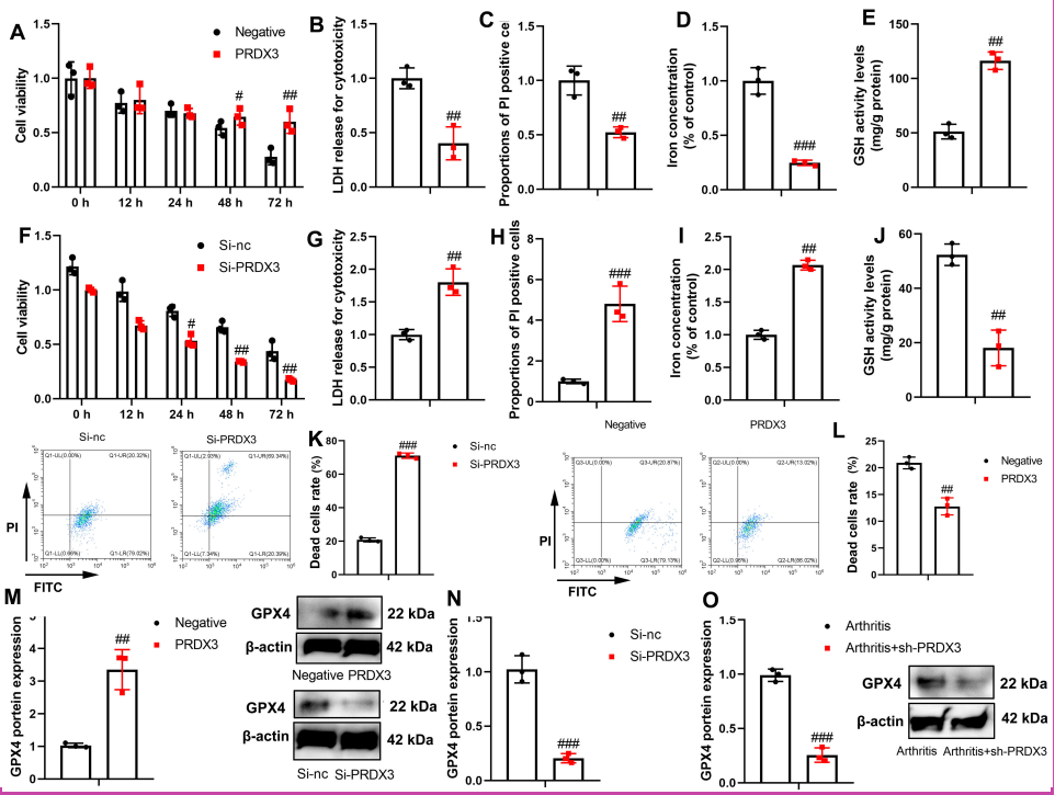 Subsequently, PRDX3 up-regulation promoted cell growth and increased GSH activity levels, and decreased LDH activity, the proportion of Propidium Iodide (PI) positivity cells, and iron concentration in the in vitro osteoarthritis model (Figure 4A-E). This process was reversed by the si-PRDX3 plasmid (Figure 4F-J). Moreover, si-PRDX3 promoted the rate of dead cells rate, whereasPRDX3 upregulation reduced the rate of dead cells rate in the in vitro osteoarthritis model (Figure 4K and L). PRDX3 up-regulation induced GPX4 protein expression and si-PRDX3 suppressed GPX4 protein expression in the in vitro osteoarthritis model (Figure 4M and N). In the mice osteoarthritis model, PRDX3 up-regulation also suppressed GPX4 protein expression in the articular tissue of osteoarthritis mice (Figure 4O).