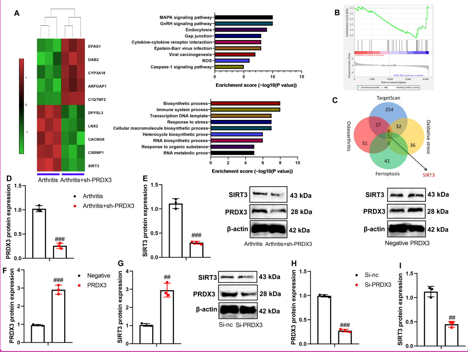 Subsequently, the mechanism of PRDX3 was investigated in mitochondria-dependent ferroptosis in osteoarthritis using a gene chip. Sh-PRDX3 down-regulated SIRT3 expression in the articular tissue of osteoarthritis mice (Figure 6A-C). Moreover, sh-PRDX3 suppressed the protein expressions of both PRDX3 and SIRT3 in the articular tissue of osteoarthritis mice (Figure 6D and E). In the in vitro osteoarthritis model, PRDX3 up-regulation led to an increase in the protein expressions of PRDX3 and SIRT3, while si-PRDX3 suppressed PRDX3 and SIRT3 protein expressions (Figure 6F-I).