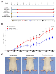 One week after curdlan injection, tacrolimus was prepared by diluting in water and orally administered to the treatment group. Mice in the disease control group were given water, while the tacrolimus treatment group received 1 mg/kg per day of tacrolimus through their drinking water. Water and drug intake were monitored weekly to ensure consistent consumption across groups. Notably, no significant differences in water intake were observed between the disease control and tacrolimus treatment groups, confirming comparable administration conditions (Table 2).