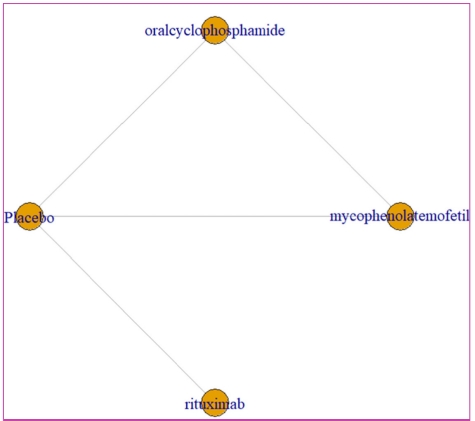 Network meta-analysis results indicated no significant statistical differences between placebo and the 4 drugs (P > .05, I 2 = 16%) (Figure 5), and there was no significant statistical difference between the drugs (P > .05). (Table 4). According to the SUCRA rankings, the top 3 drugs are rituximab (0.591), oral cyclophosphamide (0.585), and mycophenolate mofetil (0.585) (Table 5).