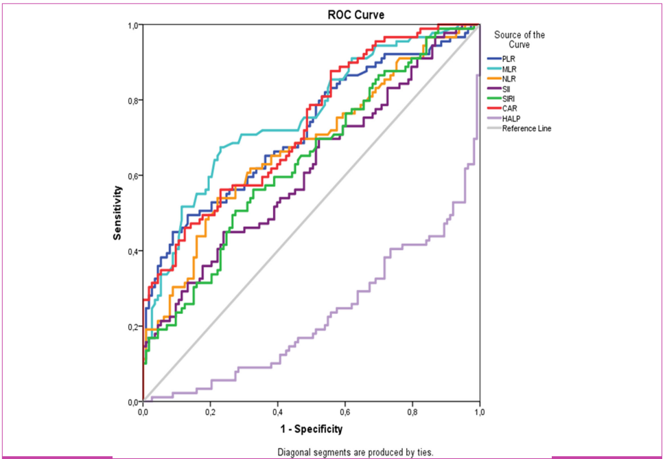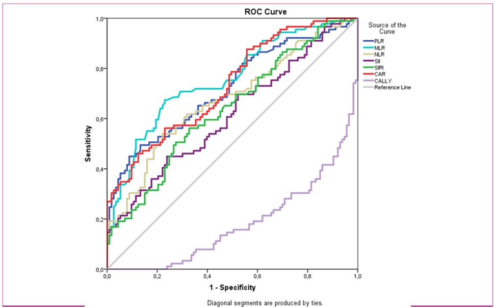 The Statistical Package for the Social Sciences (SPSS) 25.0 software program (IBM SPSS Corp.; Armonk, NY, USA) was used to execute the statistical analysis of the data. Continuous variables are expressed as mean ± standard deviation for normally distributed data or as median (interquartile range) for non-normally distributed data. Categorical variables are summarized as frequencies and percentages. For evaluating categorical data, the chisquare test was utilized. In order to determine whether the parameters being investigated had a typical distribution, the Shapiro–Wilk test was used. The Mann–Whitney U test was utilized in cases where the data did not show the normal distribution. The area under the curve (AUC), a measure of the predictive ability of PLR, MLR, NLR, SII, SIRI, CAR, HALP, and CALLY values in differentiating between patient groups were computed using receiver operating characteristic (ROC) analysis. As a consequence of the ROC analysis, threshold values were established for each variable, and sensitivity and specificity values were calculated at these points. The Spearman’s rho correlation test was applied to identify the link between continuous measurements. For all tests, the limit for statistical significance was set at P < .05.