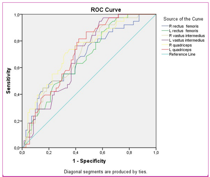 The ROC analysis was employed to assess the diagnostic performance of muscle thickness measurements in identifying sarcopenia. Results of ROC analysis for ultrasonographic muscle thickness are presented in Table 5. The cut-off value for the right and left rectus femoris muscle thickness was determined to be 1.11 cm (sensitivity was 57%, and specificity was 60%). The cut-off value for the right vastus intermedius muscle thickness was 1.17 cm, (sensitivity of 61% and specificity of 62%). For the left vastus intermedius muscle thickness, the cut-off value was 1.19 cm, with a sensitivity of 63% and specificity of 62%. The cut-off value for the right quadriceps muscle thickness was determined to be 2.31 cm, with a sensitivity of 68% and specificity of 69%. For the left quadriceps muscle thickness, the cut-off value was 2.32 cm, with a sensitivity of 68% and specificity of 62%. The results of the ROC analysis are shown in Figure 1.