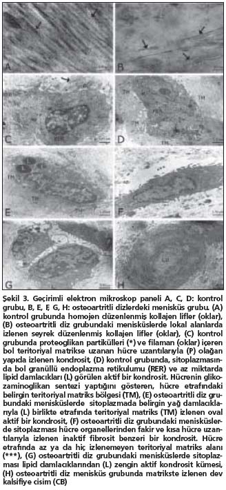 Işık mikroskobunda yapılan incelemede, normal menisküs grubunda belirgin lakünalar içinde büzüşmüş hücreler ve sıkı paketlenmiş kollajen lif yapısı izlendi. Matriksten kolaylıkla ayırt edilebilen oval ya da yuvarlak tek kondrositler görüldü. Kollajen lif demetleri homojen, düzenli ve ondülan yapıdaydı. Normal menisküsten alınan doku örnekleri geçirimli elektron mikroskobuyla incelendiğinde tüm örneklerdeki kollajen liflerin diziliminin homojen yapısı izlendi (Şekil 2A, 3A). Osteoartritli dizlerdeki menisküslerden alınan doku örneklerinde yapılan incelemede kollajen liflerde heterojen dizilim izlendi. Bazı alanlarda konsantrik fibröz demet lamellerinin organizasyonunda bozulmanın yanı sıra kalitatif olarak değerlendirildiğinde kollajen liflerin miktarında azalma vardı. Bazı lokal alanlarda son derece seyrek düzenlenmiş kollajen lifler izlendi (Şekil 2B, 3B). Her iki grupta toluidin mavisiyle boyanmış kesitler incelendiğinde hücreleri çevreleyen matriks alanında metakromazi görülen bölgeler belirlendi. Kontrol grubunda kondrositlerin etrafındaki metakromazi belirginken, osteoartritli dizlerden alınan menisküs grubunda sadece hücre proliferasyonu olan alanlarda metakromazi izlendi (Şekil 2C, 2D). Bu gruptaki tüm örneklerde, normal menisküs grubuyla karşılaştırıldığında kıkırdak hücrelerinde kalitatif olarak azalma varken, topografik gözlemlerde lokal hücre proliferasyon alanlarında kümeler yapmış hücreler ve dev kondromalar izlendi. Dev hücrelerin çevresinde bazofilik reaksiyonlar belirlendi (Şekil 2E, 2F, 3G). İnce yapı düzeyinde kontrol grubundaki kondrositler yüzeyindeki kısa uzantılar, organeller ve sitoplazmasındaki küçük lipid damlacıklarıyla olağan görünümde izlendi. Kondrositleri çevreleyen belirgin teritoriyal alan, kollajen lifler içeren matriksten kolayca ayırt edilebildi (Şekil 3C, 3D). Kontrol grubuyla karşılaştırıldığında osteoartritli dizlerdeki menisküs grubunda izlenen kondrositler daha oval ve ince uzundu. Teritoriyal matriks alanları bu grupta son derece seyrekti veya izlenemedi (Şekil 3F). Normal menisküslerdeki kondrositlerin sitoplazmasında izlenebilen küçük lipid damlacıklarının sayısı ve büyüklüğündeki artış osteoartritli dizlerdeki menisküs grubunda belirgindi (Şekil 3E). Bu grupta hücrelerarası alanda dev kalsifiye yapılar izlendi (Şekil 3H).