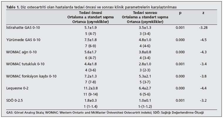 Toplam 40 hastanın 34’ü kadın, 6’sı erkekti. Yaş ortalaması 62.5±9.4, Beden Kitle İndeksleri (BKI) 29.0±6.5 olarak hesaplandı. Tablo 1’de görüldüğü gibi, tedavi öncesi ve sonrası değerlendirmelerde iki grup arasında GAS, WOMAC, Lequesne ve SDÖ skorları arasında anlamlı fark vardı (p <0.05) tedavi sonrası değerlendirmede, ağrı şiddeti azalmış ve fiziksel kısıtlılık azalmış, fonksiyonel kapasite artmış olarak bulundu.
