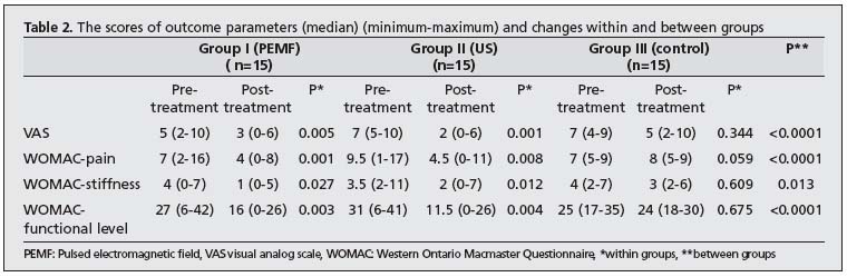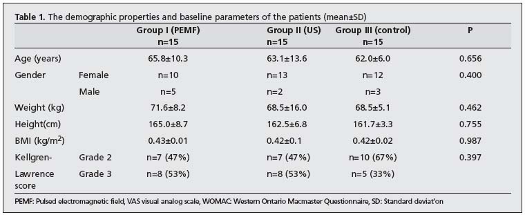 Material and Methods: Forty-five patients with knee osteoarthritis (mean age: 63.5±10.2 years) were randomly assigned to three groups. The first group received pulsed electromagnetic field therapy (frequency: 2 Hz, 100 Hz, 25 Hz consecutively, 35 minutes/ session), the second group received therapeutic US (frequency: 1 MHz, power: 1.5 watt/cm2 continuously, 10 minutes/session) and the third group served as the no- treatment control group. Evaluations were done at baseline and at the end of the treatment (third week). Assessment parameters were pain, stiffness and functional level scores of the Western Ontario and McMaster Universities (WOMAC) questionnaire and pain severity evaluated by Visual Analog Scale (VAS) (0-10).
