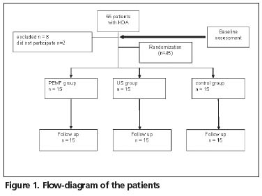 Patients were randomly allocated to three groups by sequential assignment, according to their application turns. First group (1st, 4th, ...43rd) recieved PEMF therapy, second group (2nd, 5th, ...44th) recieved US therapy, third group (3rd, 6th, ...45th) recieved no treatment. Figure 1 shows the randomization and follow-up process of the groups. Neither the assessors nor the patients were blinded.