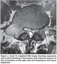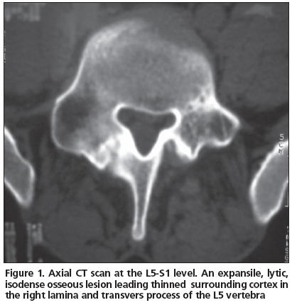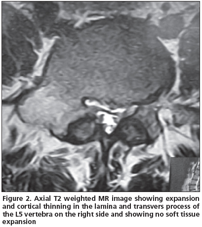 A 21 year-old male patient admitted to our clinic with low back pain persistent to medication for the last 3 years. He was first referred to physical medicine and rehabilitation department and then to a neurosurgery department after several visits because of persistent pain. He had no history of trauma. His pain was not aggravated by coughing, standing or sitting; and the pain was not relieved by salicylates or NSAIDs. Whole blood count (CBC), erythrocyte sedimentation rate (ESR) and rheumatoid factor (RF) were found within normal limits. Physical examinations were found normal except the tenderness extending from T12 to L5 associated with paravertebral muscle spasm. His lumbosacral CT was taken and then a tumoral mass was noticed enlarging transverse process and right lamina of L5 vertebrae with probable diagnosis of osteoblastoma or osteoid osteoma. The mass had a lytic nature with well defined osteosclerotic boundaries and facet joints were normal (Figure 1). An MRI was taken to evaluate the soft tissue expansion which showed no affection (Figure 2). A CT-guided biopsy resulted with unsatisfactory sample gathering. Then he has taken to the operation theatre and curettage and frozen section was performed since the probable diagnosis was osteoblastoma. After confirmation of benign tumoral process, the cavity was filled with allograft. The histopathological examination confirmed the diagnosis of osteoblastoma. Following surgery, the patient was asymptomatic; there was no neurological dysfunction and no residual pain or discomfort. No recurrence has been observed for four years.