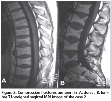 Twenty-six years old female patient was admitted to our rheumatology out-patient clinic with the complaint of low back pain. Her pain started 4 months ago, immediately after delivery of her first child. The pain was aggravated by physical activity and diminished with nonsteroidal antiinflamatory drugs. Lumbar MRI was carried out with the prediagnosis of lumbar disc herniation. Vertebral deformities due to compression fractures were discovered both in the dorsal and lumbar vertabrae (Figure 2), and the patient was hospitalized for differential diagnosis.