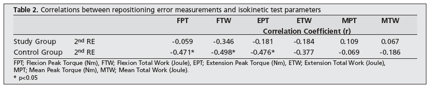 The correlation between 2nd RE measurement and flexion torque and total work values were found statistically significant in control group (p<0.05) in contrary to study group (p>0.05). Nevertheless, there was no significant correlation between 2nd RE measurement and extension test parameters in either group (p>0.05) (Table 2). When we deal with the alteration between 1st RE measurement and 2nd RE measurement, there was no significant difference between two groups (p>0.05).
