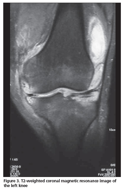 A 72-year-old male patient was admitted to our outpatient clinic with pain, swelling, and limited range of motion of the left knee, and difficulty in walking. His knee complaints had begun suddenly 1 year ago and he also had intermittent right hip joint pain. He had 1 hour of morning stiffness and his symptoms were slightly reduced by activity. He did not have any episodes of infections prior to symptom onset. He did not report fever, weight loss or sweating, and his rheumatologic history was uneventful other than his joint complaints. Despite the use of several non-steroidal anti-inflammatory drugs, there was no improvement in his knee pain, swelling, and range of motion. The anamnesis of the patient was unremarkable except he was treated for pulmonary TB 50 years ago and underwent surgery on his right hip due to trochanteric bursitis 3 years ago. On physical examination swelling and limited range of motion was observed in left knee. After activity, pain and increased temperature was also noted. His right hip joint motion was mildly painful without any limitation. Laboratory investigations revealed a white blood cell count of 6200/uL (normal range; 4800-10800/uL), hemoglobulin level of 12.8 mg/dL (normal range; 12-17 mg/dL), platelet count of 630.000/uL, erythrocyte sedimentation rate of 59 mm/h (normal range; 0-20 mm/h), blood glucose level of 110 mg/dL (normal range; 70-110 mg/dL), a C-reactive protein level of 8.99 mg/dL (normal value; <0.3 mg/dL), RF level of 63.70 IU/mL (normal value; <19 IU/mL), and anti-CCP antibody as 21.8 U/mL (normal value; 0-5 U/mL). The synovial fluid examination revealed a white blood cell count of 16.200/uL and a blood glucose level of 12 mg/dL. Marginal erosions were noted on the radiograph of the left knee (Figure 1). The anteroposterior pelvic radiograph revealed a region of ossification lateral to the right hip joint corresponding to the trochanteric bursa region. Magnetic resonance imaging (MRI) of the left knee revealed extensive hyperintense synovial thickening and erosive changes within the joint cavity, including all knee compartments and the suprapatellar bursa on T2-weighted images (Figures 2, 3). On contrast-enhanced MRI evaluation, fields of necrosis associated with infection showing peripheral enhancement were observed. Bone and joint pathologies defined in these investigations were compatible with infection. The differential diagnosis included arthritis, osteomyelitis, and especially TB, thus the Departments of Infectious Diseases, Chest Diseases, and Orthopedics were consulted. The Department of Infectious Diseases recommended that two consecutive joint aspiration samples should be screened for acid-resistant bacilli (ARB). Indeed, ARB were detected in both joint aspiration fluid samples. On lung tomography, as recommended by the Department of Chest Diseases, revealed fibrotic scars in the bilateral upper lobes, which were thought to be secondary to previous infection. Arthroscopic debridement was performed by the Department of Orthopedics and the biopsy result was compatible with a granulomatous inflammatory reaction. The patient was diagnosed with TB arthritis and treated accordingly. Clinical and laboratory improvement was noted on follow-up.
