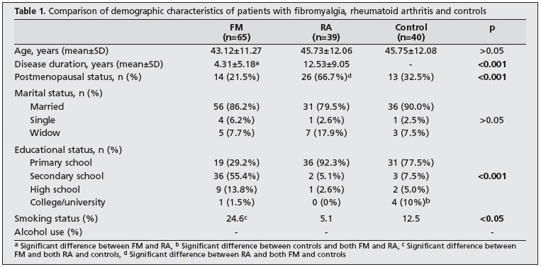 The mean age was 43.12±11.27 years (range, 20-57 years) in patients with FM (n=65), 45.73±12.06 years (range, 25-60 years) in patients with RA (n=39), and 45.75±12.08 years (range, 29-56 years) in controls (n=40). There was no significant difference between the three groups in terms of age (p>0.05). The mean duration of disease was 4.31±5.18 years in the FM group and 12.53±9.05 years in the RA group (p<0.001). When groups were compared in terms of educational status, the number of patients with a primary school education in the RA group was higher compared to the FM group and there were more individuals with college/university education in the control group compared to the other two groups and the difference between the groups was statistically significant (p<0.001). The marital status of patients and controls was similar. None of the subjects in the patient and control groups used alcohol. The smoking rate in the FM group (24.6%) was higher than the RA (5.1%) and control groups (12.5%; p<0.05). The demographic data of the patients are presented in Table 1.