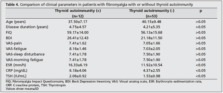 Results: The rates of TPOAb and TgAb positivity were 13.8% and 15.4%, 2.6% and 5.1%, and 5.0% and 5.0% in the FM, RA, and control groups, respectively; there was no significant difference between the groups. Thyroid autoimmunity was noted in 18.5%, 5.1%, and 7.5% of the patients in the FM, RA, and control groups, respectively; there was no significant difference between these groups. There were significant differences between the groups with respect to widespread pain, sleep disturbances, fatigue, and morning fatigue evaluated by VAS and the mean FIQ and BDI scores; the highest values were noted in the FM group. Significantly higher ESR, CRP and TSH levels, and proportion of postmenopausal women were noted in FM patients with thyroid autoimmunity compared to FM patients without thyroid autoimmunity. No significant difference existed between RA patients with or without thyroid autoimmunity.