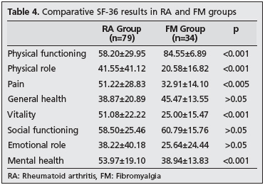 Materials and Methods: The swollen joint count (SJC) and the tender joint count (TJC) of 79 patients with RA and 34 patients with FM, the Patient Global Assessment (PGA) with 100 mm visual analog scale (VAS), and erythrocyte sedimentation rates (ESR) were recorded and DAS28-4v scores were calculated. The quality of life in both groups was evaluated by using SF-36.