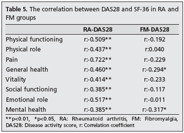 Result: The mean DAS28-4v score of the RA group was 3.63±1.52 (0.77-7.40) and of the FM group was 2.42±0.73 (0.57-3.86), and the difference between groups was statistically significant (p<0.001). In the Principal Component Analysis (PCA), in the RA group, the components that most affected DAS28-4v were TJC and SJC, while in the FM group, these were SJC and PGA. Significant differences were detected between the two groups in most SF-36 subgroups, except in the general mental health, social functioning and social role limitation subgroups. In the FM group, the physical function subgroup was significantly higher (p<0.001).