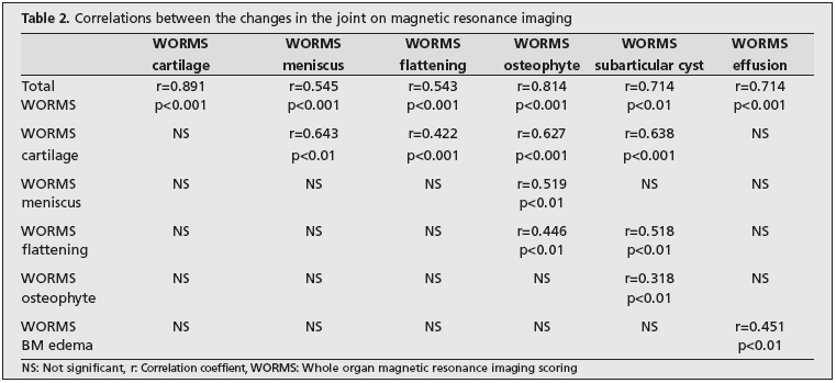 Materials and Methods: Ten men and 24 women between 30 and 60 years of age, who fulfilled the American College of Rheumatology (ACR) criteria for knee OA, were included in the study. All patients underwent MRI of the more symptomatic knee and the MRI findings were evaluated by the same radiologist blinded to clinical findings, using a semi-quantitative whole-organ MRI scoring method (WORMS). The Western Ontario and Mc-Master University (WOMAC) osteoarthritis index was used to assess physical function, morning stiffness, and joint pain.
