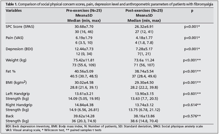 Materials and Methods: Twenty-five female patients with an age range of 33 to 63 years (mean: 49.16±7.51) were evaluated. All patients had been diagnosed with FMS according to the American College of Rheumatology (ACR) criteria. Patients underwent a Pilates exercise program consisting of one hour of exercise performed three times per week for 12 weeks. Prior to exercise and at the end of the 12th week, the patient's weight, grip strength of the hands, back strength, body fat ratio, and BMI were measured. Before- and after-exercise measurements were compared. The patient pain level was determined using the visual analog scale (VAS). Beck Depression Inventory (BDI) was used to define the depression level of patients. SPC level of patients was obtained by Social Physique Anxiety Scale (SPAS). The correlations between SPC scores and anthropometric values and pain and depression levels were evaluated.