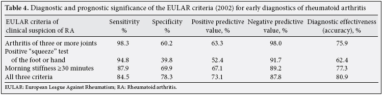 Patients and methods: The subjects were 250 outpatients (211 females, 39 males; mean age 46.1±11.8 years; range 19 to 73 years) with ”early arthritis”. The mean disease duration was 4.9±3.3 months. The criteria of inclusion of patients in the study were: (i) patients aged 18 years and older, (ii) clinical suspicion of RA according to EULAR (2002) criteria or persistent arthritis/arthralgia (>6 weeks), (iii) duration of disease <1 year, and (iv) written consent of the patient to participate in the study. The exclusion criteria were: (i) presence of a definite diagnosis of other rheumatic diseases before the onset of the study, and (ii) refusal of the patient to participate in the study. The diagnostic significance of the criteria was determined by the sensitivity and specificity. Predictive significance was estimated on positive and negative predictive values. The diagnostic effectiveness was also considered.