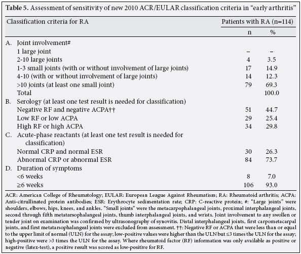 During the two-year observation of patients with a diagnosis of UA, RA was identified in 56 patients. As a result, of the 250 patients with “early arthritis” at the start of the study the diagnosis of RA was confirmed in 114 (45.6%) patients. Assessment of the 2010 ACR/EULAR classification criteria for RA was performed in this group with the use of parameters that were identified at the moment of recruitment into the clinical trial. The scoring system was based on the presence of synovitis in at least one joint, absence of an alternative diagnosis that explained the synovitis better, and achievement of a total score of six or greater (of a possible 10) from the individual scores in four domains: number and site of involved joints (score range 0-5), serologic abnormality (score range 0-3), elevated acute-phase response (score range 0-1) and symptom duration (2 levels; range 0-1).[8] Hence, the cut-off point for “definite RA” was set at ≥6/10.