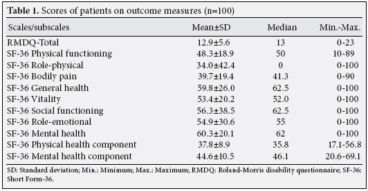 The mean disease duration was 88.4 months (median: 24, minimum-maximum: 1-600 months). Twenty nine percent of the patients were employed and the rest were retired (30%), housewives (35%) or unemployed (6%). The scores of patients on RMDQ and SF-36 are shown in table 1.