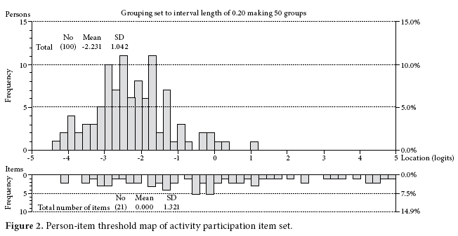 There are a number of limitations to the study. The first one is the sample size which only gives a certain degree of precision to item and person location, although when well targeted, this sample size will give an estimate of item difficulty to within 0.39 logits. Given the Rasch model allows an adaptation to interval scaling, a nomogram giving the exchange rate between the raw score and latent interval scale estimate would have been useful. However, this does require a larger sample size (e.g. 250 cases or 20 times the number of items, whichever is the larger) and so will have to wait until larger replications are undertaken. The collapsing of categories also impedes the production of the exchange rate as this will require further evidence and consensus of scoring options. Another limitation is the non-heterogeneity of our patient population which includes mostly non-employed females with considerably less disability levels.