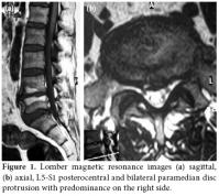 A 49-year-old man complained of pain and swelling of the feet and ankles, particularly on the left side. Two months previously, he had experienced an episode of low back pain radiating down the left leg which developed after an episode of bending and lifting. At that time, he was diagnosed with LDH which was confirmed by magnetic resonance (MR) imaging. The lumbar spine MR images showed L5-S1 disc protrusion in the posterocentral region and in bilateral paramedian regions which was more apparent on the right side (Figure 1). His pain decreased after several days of bed rest and analgesic treatment. One month later low back pain, aching and stiffness developed in the joints of both ankles and feet and was accompanied by dorsal hyperalgesia and allodynia of the left foot. The aching was exacerbated by local pressure or attempted foot movement. Over the next month the symptoms steadily worsened to the point of an inability to bear any weight on the right foot. Mild swelling of the feet, edema, and hyperhydrosis of the left foot were also noted. Ankle motion was restricted near the end of range. There was a complaint of low back discomfort. Straight leg raising on the left side was only 45 degrees. There was a suggestion of mild plantar flexor weakness (4/5, 0 to 5 scale) on the left, but extreme pain on palpation of the left lower extremity prevented reliable motor strength and sensorial evaluation. The remainder of the neuromuscular examination was unremarkable. Rectal tone was intact, and pulses were normal. The patient had no history of trauma. Past medical history, family history and a review of systems were unremarkable revealing no indication of endocrine, rheumatologic or other systemic diseases.
