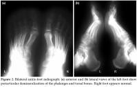Comprehensive conservative therapy was commenced consisting of drug treatment (non steroidal anti-inflammatory drug [NSAID], gabapentin and calcitonin nasal spray), an outpatient rehabilitation program involving active and passive range of motion to both ankles with gentle stretching, desensitization activities (including contrast baths), gait training, and a physical therapy program involving hot packs, ultrasound and TENS to the lumbar region. Three weeks later, the back pain was totally relieved and lower extremity symptoms were mainly relieved in six weeks. There was no residual foot stiffness, swelling, edema or any atrophic changes. Electromyography six months after therapy showed a decrease in denervation. No recurrence occurred after a follow-up of 12 months.