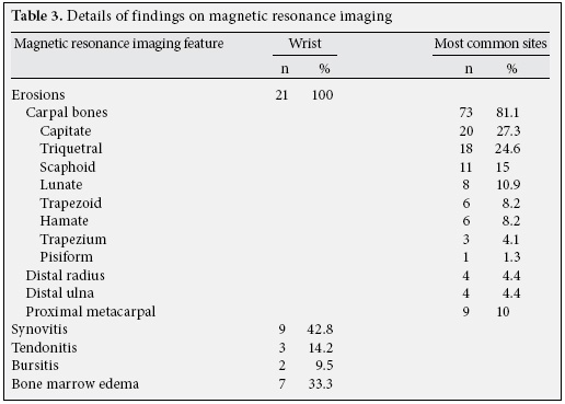 Among the twenty-one cases showing erosion in the MRI, nine (42.8%) showed synovitis findings whereas 12 had no such sign. Three (14.2%) of the cases had synovitis and two had (9.5%) bursitis. Bone marrow edema was found only in seven (33.3%) of the cases.