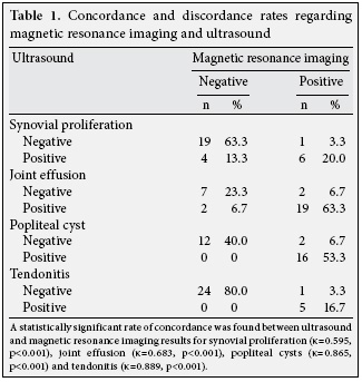 Patients and methods: Thirty consecutive (25 females, 5 males; mean age 55.9 years; range 38 to 74 years) rheumatoid arthritis patients with 30 symptomatic knees were included in the study between November 2006 and August 2008. The intrarticular effusion, synovial proliferation, popliteal cysts and patellarquadriceps tendonitis and weight bearing femoral condylar cartilage thickness and morphology were assessed by US and, within five days, a magnetic resonance imaging (MRI) examination was performed. The results of both examinations were interpreted blindly and compared by two experienced radiologists in their field.