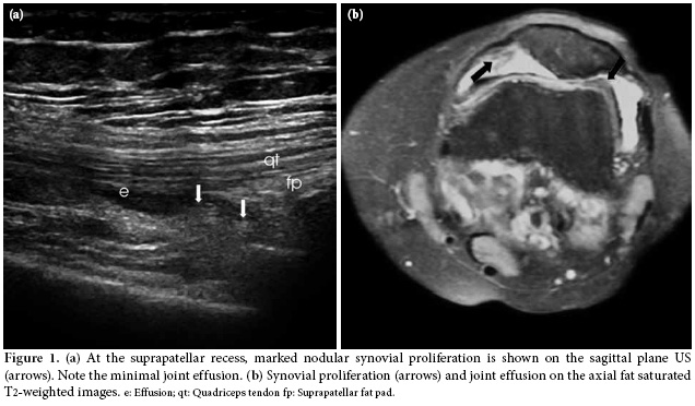 There was also a significant concordance (k=0.595, p<0.001) on synovial proliferation, and a consensus was reached in 25 patients. Unfortunately, for the results of five patients, there was a disagreement because the MRI showed a minimal proliferation in one, which was not noticed on the US, while in the other four cases, proliferation was not seen on the MRI but diagnosed on the US. For these patients, it was speculated that the synovium might have been mistaken for the suprapatellar fat and regarded as proliferation.
