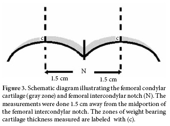 In the second position, the weight bearing medial and lateral femoral condylar cartilage thickness and clarity were evaluated with the knee in maximum flexion. The femoral condylar cartilage was measured on the weight-bearing area approximately 1.5 cm away from the intercondylar notch (Figure 3). The cartilage morphology was assessed using a scale: 1 for regular-clear (Figure 4a, b) and 0 for irregular, non-clear (Figure 5a, b). Finally, all the patients were evaluated for popliteal cysts with the knee extended in a prone position, and any presence of popliteal cysts was recorded.