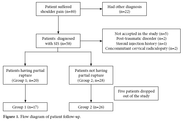 Magnetic resonance imaging findings revealed subacromial impingement syndrome stage I and II. Regarding the MRI findings, patients were allocated into two groups according to whether partial supraspinatus rupture was present (group 1; 13 females, 4 males; mean age 58.3±7.3 years) or not present (group 2; 18 females, 8 males; mean age 49.3±7.5 years). Exclusion criteria were the following: Zlatkin stage III with full thickness tears, positivity of drop arm test, shoulder instability, frozen shoulder, calcifying tendinitis, acute bursitis and steroid injection history to shoulder within three months, concomitant cervical radiculopathy, degenerative arthritis of the glenohumeral joint, shoulder instability and posttraumatic disorders.