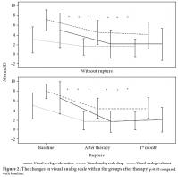 The duration of non-operative treatment has varied widely in the literature.[6,7] The duration of non-operative treatment is a clinical decision that should be based on the specific set of circumstances associated with the individual patient. Although conservative therapy periods can be generally lengthened for up to several months, there are some studies reporting positive short-term efficacy. In our study, we also observed short term efficacy on pain, function and ROM of SIS patients both with and without ruptures.