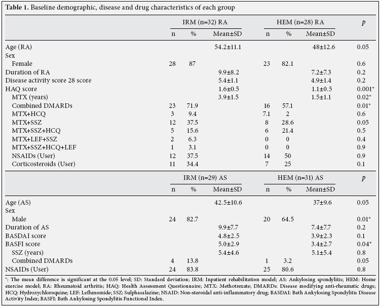 Objectives: We compared the inpatient rehabilitation model (IRM), provided by the physiatrist, physical therapist, rehabilitation nurse and clinical psychologist, with the home exercise model (HEM), provided by the physiatrist for the rehabilitation of patients with rheumatoid arthritis (RA) and ankylosing spondylitis (AS).