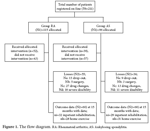 A flow diagram of this study with the pool of potential patients showing that all were registered and randomized was shown in Figure 1. The online recorded, pre-planned study population was 115 patients with RA and 96 patients with AS.