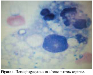 A 40-year-old female patient who has been treated as AOSD for four years was referred to our clinic with complaining of high spiking fever, myalgias, sore throat and weakness. Concomitantly she was observed to have a maculopapular skin rash on her forearms which had appeared 10 days previously. She was hospitalized with her complaints. In her medical history, she was treated as AOSD with MTX 10 mg/week. On the second visit, the MTX dose was increased to 15 mg/week. Her vomiting improved, so she stopped using MTX. After she was hospitalized, a physical examination revealed diffuse myalgias, arthralgias of hip and knees, a symmetrical pink maculopapular style of evanescent rash and a high spiking fever. The fever was normal from 6:00 AM to 3:00 PM as 36.0 °C, but it increased from 3:00 PM to 6:00 AM. The highest temperature was seen at 2:00 AM as 39.6 °C. Laboratory data was as follows: leucocytes (WBC): 23450 /mm3 (n=5200-12400), neutrophils (NEU): 22060 /mm3 (n=1900-8000), hemoglobin (Hb): 12.0 g/dl (n=12-18), hematocrit (Htc): 37.4% (n=37-52), mean corpuscular volume (MCV): 82.7 fL (n=80-99), erythrocytes (RBC): 4.21x106/mm3 (n:4.20-6.10x106), platelets (Plt): 478000/mm3 (n=130000-400000), ESR: 92 mm/h (n=0-25), CRP: 30.0 mg/dl (n=0-0.5), alanine aminotransferase (ALT): 22 IU/l (n=0-55), aspartate aminotransferase (AST): 19 IU/l (n=0-27), total cholesterol (TC): 107 mg/dl (n=120-200), triglyceride (TG):117 mg/dl (n=40-150), vitamin-B12: 961 pg/ml (n=197-866), ferritin: 11052 ng/ml (n=15-150), lactic dehydrogenase (LDH): 1338 IU/l (n=0-480), RF: 11.2 IU/l (n=0-14). The antinuclear antibody was negative, and blood, urine and throat cultures remained sterile. Serologies for Epstein-Barr virus (EBV), Cytomegalovirus (CMV), Hepatitis B virus (HBV), Hepatitis C virus (HCV), Varicella-zoster virus (VZV) were negative. She was given oral tenoxicam 10 mg/day, oral methylprednisolone 60 mg/day and oral amoxicillin 1 mg/kg/day at the treatment. On the 4th day of hospitalization, her clinical condition was worse with abdominopelvic pain and her vital signs were blood pressure: 90/60 mmHg, fever: 39.7 °C, pulse: 95/dk. Laboratory data was as follows: WBC: 1026 /mm3, NEU: 274 /mm3, Hb: 6.2 mg/dl, Htc: 17.9%, RBC: 1.41x106 /mm3, PLT: 8000 /mm3, ESR: 131 mm/h, CRP: 29.58 mg/dl, ALT: 169 IU/l, AST: 106 IU/l, TC: 224 mg/dl, TG: 208 mg/dl, vitamin-B12: 1018 pg/ml, ferritin: 11124 ng/ml, LDH: 1320 IU/l. For febrile neutropenia and pancytopenia, a bone marrow puncture-biopsy was examined. It revealed increased proliferation of benign macrophages with hemophagocytosis (Figure 1). Abdominopelvic ultrasonography revealed that vertical length of spleen was 15 cm. Then the patient was diagnosed with hemophagocytic syndrome. On that day the patient was given two units of blood and two units of erythrocyte suspensions. Methylprednisolone 80 mg/day intravenous and granulocyte colonystimulating factor (G-CSF) were added to the treatment for four consecutive days. On the first week of the follow-up, the patient's clinical condition was better. Granulocyte colony-stimulating factor was discontinued, and methylprednisolone was continued to be given at 80 mg iv/day. On the second week omitted, laboratory data was normalized as follows: WBC: 8690 /mm3, NEU: 6130 /mm3, Hb: 12.7 gr/dl, Htc: 38.3%, MCV: 84 fL, RBC: 4.63x106, Plt: 358000 /mm3, ESR: 21 mm/h, CRP: 0.5 mg/dl, ALT: 18 IU/l, AST: 23 IU/l, TC: 161 mg/dl, TG: 105 mg/dl, ferritin: 147 ng/ml, LDH: 247 IU/l. Then the steroid dose was tapered. Her treatment was regulated before being discharged.