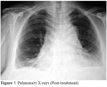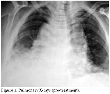 Pulmonary X-rays showed moderate and severe bilateral pleural effusion, more pronounced in the right lung, and an increased cardiothoracic index.