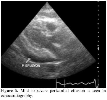 A 47-year-old female patient was admitted to the Yüzüncü Yıl University Faculty of Medicine cardiology clinic with complaints of shortness of breath and palpitations in August 2009. Medium to severe pericardial effusion was detected in an echocardiography examination. Suspecting cardiac tamponade, fluid was drained immediately and in the screening for pericardial effusion, leukocytosis (7200 leukosytes per mm. cub.) was determined. With the diagnosis of pericarditis, ceftriaxone and ciprofloxacin were started. However, no bacterial reproduction was seen in the patient᾿s pericardial fluid or blood cultures. This appeared to be on account of pericarditis due to rheumatoid arthritis. The patient was conscious and cooperative. She had complaints of widespread joint pain, chest pain, shortness of breath, and palpitations. Three weeks after starting sulphasalazine treatment for fever, the patient developed a swollen nose and cheeks along with erythema on her back. These findings were followed by increased skin complaints when exposed to sunshine. Shortness of breath and palpitations developed afterward. An examination revealed pain, swelling, and increased temperature in the carpometacarpal and metacarpophalangeal joints along with a limitation of motion in the left knee. Ulnar deviation and swan-neck deformity were detected in both hands. Tests revealed a blood pressure of 90/60 mmHg and a cardiac pulse rate of 120/min. and a body core fever of 37 centigrate. In a laboratory examination, the following was discovered: leukocyte count 18000, Hgb: 11.5 g/dl, platelets: 365.000, erythrocyte sedimentation rate (ESR): 34 mm/hour, CRP: 18.5 mg/dl, GGT: 283 U/L (5-31), ALT: 40 U/L (0-31), AST 35 U/L (0-31), LDH: 730 U/L (240-480), RF: 141 IU/mL, and anti-CCP was found to be positive.