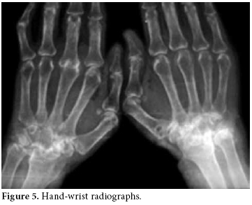 The RA disease activity score (DAS) was calculated as 6.14. Predominant findings in hand X-rays were symmetric joint erosions in carpal bones along with ankylosis leading to contracture, joint space narrowing, cystic changes, and periarticular osteoporosis (figure 5).