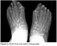 In foot-ankle X-rays, periarticular osteoporosis, hallux valgus, and joint space narrowing had progressed to the ankylosis of tarsal bones (figure 6).