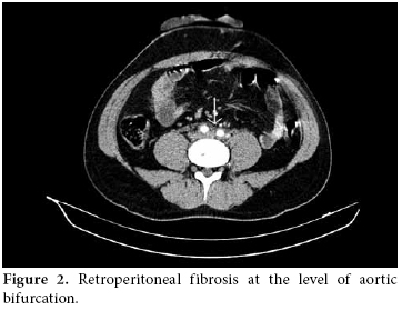 Retroperitoneal fibrosis (RPF) is a clinical entity characterized by the progressive proliferation of the connective tissue which on rare occasions forms a mass involving the periaortic area in the abdomen. It was first described by the French urologist Albarran in 1905, but the etiology is still unclear.[1-3] This process is a chronic inflammatory response to a number of possible inciting factors, including infections, tumors, and systemic processes such as lupus, vasculitis, and auto-allergic reactions.[2,4] Only a few cases of the coexistence of systemic lupus erytematosus (SLE) and RPF have been reported in the recent literature. Although the vascular complications of SLE have been extensively documented in the literature, aortitis is very rare in patients with SLE.[1] Most cases of lupusassociated aortitis have been described in conjunction with aortic aneurysms or aortic dissection and have been documented either at autopsy or during surgery to repair a dissection.[1]