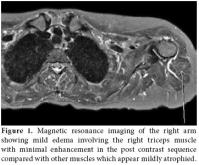 In December 2009, the adalimumab frequency was decreased to once per month. As the patient wanted to conceive, a slow tapering of her methotrexate dosage was started with a plan of reaching 7.5 mg/week over a threemonth period followed by complete discontinuation for at least three months prior to conception. In April 2010, she presented with symptoms of profound weight loss, night sweats, intermittent fevers, and a sore throat. She had stopped the methotrexate and adalimumab during her febrile episodes. She did not have any clinical signs of active arthritis, and there was no lymph node enlargement. She had a high CRP rate of 42 mg/L, leukopenia of 2.63x103g/L, and lymphopenia of 0.86x103 g/L. All tests to rule out infection were negative, including blood, urine, and stool cultures. Brucella titer, malaria, schistosomiasis, human immunodeficiency virus (HIV), Epstein-Barr virus (EBV), and cytomegalovirus (CMV) serologies were all negative. Computed tomography (CT) scans of the head, neck, paranasal sinuses, chest, abdomen, and pelvis were all within normal limits, as well. She was kept on naproxen and paracetamol to control her pain and fever and also received a course of oral antibiotics from a local facility for presumed pharyngitis. An otolaryngology (ENT) referral failed to demonstrate an etiology for her symptoms. Three weeks later, she presented with diffuse muscle weakness, which was mainly proximal rather than distal. She was unable to get out of bed, climb stairs, or even stand from a sitting position. She had signs of active arthritis in two metacarpophalangeal (MCP) joints in the right and bilateral wrist joints. She had a mild hyperpigmented area around the mouth, but no skin rashes elsewhere. The results of respiratory and cardiac examinations were normal. After admission to the hospital, further tests ruled out thyroid and adrenal disorders. The ANA titer was 1:1280, and the anti-ds DNA was 27.5 U/ml (normal value 0-20 U/ml). Her CRP level was high at 56 mg/L while her creatinine kinase (CK) level was entirely normal. Electromyography (EMG) showed the presence of spontaneous activities suggestive of inflammatory myopathy. Magnetic resonance imaging (MRI) of the right arm showed mild edema involving the right triceps muscle with minimal enhancement in the post contrast sequence (Figure 1). Biopsies of both the right arm (triceps muscle) and right thigh (vastus lateralis muscle) were taken, and the MRI of the right arm revealed inflammatory myositis (focal mild perivascular and endomysial lymphohistiocytic inflammation), (Figure 2). The MRI of the thigh was normal. She was diagnosed with a case of adalimumab-induced lupus myositis and received 1 gm of methylprednisolone intravenously daily for three days. She was then maintained on 60 mg per day for 28 days. Given her profound weakness, rituximab 1000 mg was given intravenously and was well tolerated. She was discharged on May 31, 2010 and continued taking prednisone 60 mg per day. Two weeks later, she received another dose of rituximab 1000 mg. She was maintained then on a tapering regimen of prednisone, azothioprine 50 mg twice daily, hydroxychloroquine 200 mg twice daily, plus calcium and vitamin D. During her last assessment eight months later, she was asymptomatic with normal muscle strength, CRP, anti-dsDNA (11U/ml), and ANA titer (1:360) and was no longer on steroids.