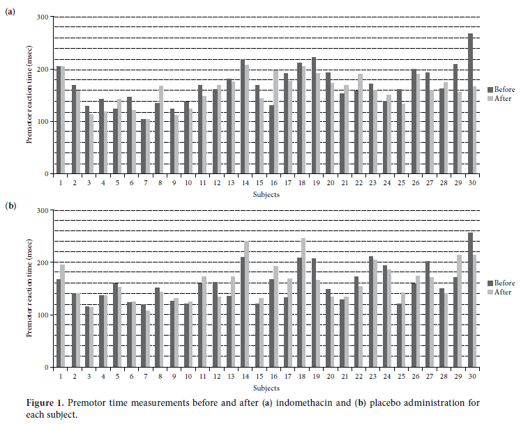 Patients and methods: In this cross-sectional, randomized, placebo controlled, double-blind, cross-over study, 30 healthy adults (8 males, 22 females; mean age 32.4±5.3 years; range 24 to 42 years) received a single dose of 25 mg indomethacin (Endol, oral capsule, DEVA Pharmaceutics, Kartepe, Turkey) and placebo. Premotor reaction and response times were measured electromyographically before and after the administration of preparations by a blinded researcher in the Electrophysiology Laboratory at Gazi University, Faculty of Medicine, Department of Physical Medicine and Rehabilitation, Ankara.