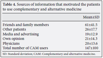 Most of the users were motivated to use CAM by their friends and family members (41.5%) or by other patients (17.7%), and by mass media and advertising (12.9%) (Table 4). The percentage of patients who decided to use CAM on their own was 14.3%. Only 13.6% of the users had been referred by their physicians to use CAM therapies. Most of the users (60.5%) did not desire to talk about their CAM use with their physicians. The rest of the users (39.5%) expected to receive information about CAM from their physicians and talked about it with them. However, their physicians were frequently (50%) incurious about the patients’ CAM use, with 37.9% being in favor of it and 12.1% against the use of CAM therapies.