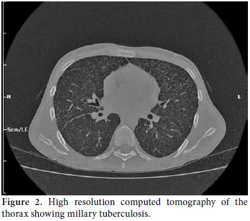 A 22-year-old male patient was presented to the emergency room of our hospital with complaints of fever, headache, and fatigue which had been occurring for 10 days. The medical history revealed that he had been diagnosed as having Behçet’s disease in 2007 and had been using prednisolone since the time of diagnosis. The dosage of prednisolone was increased up to 64 mg/day by the supervising clinician. Cyclosporine-A had been added to the treatment at 100 mg/day two months previously due to eye involvement but was discontinued after one week due to side effects of fever, fatigue, and headache. The patient was prescribed azathioprine at 100 mg/day on the follow-up visit, and he had been using this drug for nearly 10 days prior to being admitted to our hospital. The physical examination findings revealed a body temperature of 39.8 °C, arterial blood pressure of 110/70 mmHg, and a heart rate of 112/per minute. Neck stiffness was minimally positive. He had swelling and sensitivity on palpation in the right scrotal region that had started three months earlier. Laboratory examinations were as follows: leukocyte count 7.400/mm3, erythrocyte sedimentation rate 87 mm/h, C-reactive protein: 13.4 mg/dl in cerebrospinal fluid (CSF) analysis, leukocyte count: 20/mm3, protein: 200 mg/dL, and glucose: 27 mg/dL (blood glucose: 94 mg/dL). There was no growth on the CSF culture. A chest X-ray was normal. Since the CSF findings and physical examination results could not rule out bacterial meningitis, he was started on ceftriaxone 2x2 gr intravenously. He had no regression of complaints in the first week of treatment, and his antibiotic treatment was discontinued. Internal disease and neurology consultations in conjunction with the clinical findings and CSF results led to a diagnosis of neuro-Behçet’s disease. Scrotal ultrasound screening was consistent with epididymitis. A large number of leukocytes were observed in the material aspirated from the testis (90% lymphocyte in nature). Ehrlich- Ziehl-Neelsen (EZN) staining detected acid-resistant bacteria. Treatment with isoniazid, ethambutol, pyrazinamide, and rifampicin was initiated under the diagnosis of testis tuberculosis. Subsequently, chest high resolution computed tomography (HRCT) and brain magnetic resonance imaging (MRI) were done. The chest HRCT result was consistent with miliary tuberculosis (Figure 1), and the brain MRI revealed findings were consistent with tuberculous granuloma and tuberculous meningitis (Figure 2). The vertebral MRI showed that widespread lytic lesions in the vertebra corpuses and the tissue swelling adjacent to the vertebra were consistent with Pott’s disease and spinal granuloma (Figure 3a and 3b). Based on these examinations, the patient was considered to have disseminated tuberculosis (testicular tuberculosis, miliary tuberculosis, tuberculosis meningitis, spinal granuloma, and Pott’s disease). The anti-tuberculous treatment was revised with the ethambutol being replaced by streptomycin. The patient’s body temperature returned to normal on the eighth day of treatment. The patient, whose general condition was observed to improve, is still receiving the treatment.